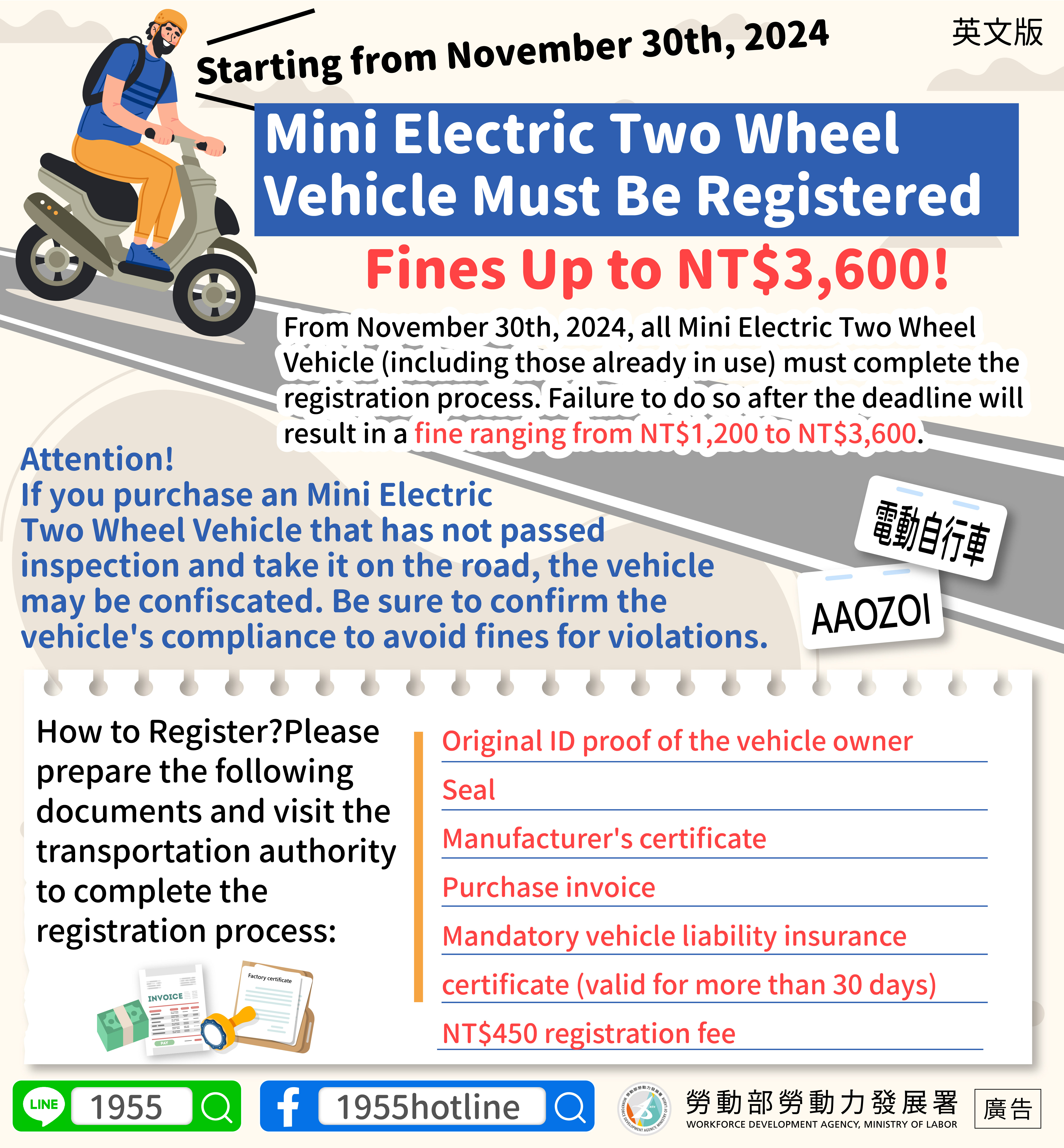 From November 30th, 2024, all Mini Electric Two Wheel Vehicle (including those already in use) must complete the registration process. Failure to do so after the deadline will result in a fine ranging from NT$1,200 to NT$3,600.
